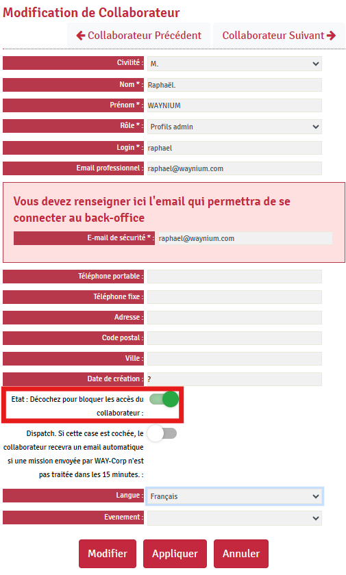 On the collaborator's page, you will see a button labelled ‘Status: Uncheck to block the collaborator's access:’. To deactivate the profile, simply uncheck this box. (Don't forget to click on ‘Modify’ at the bottom of the page to save your action).