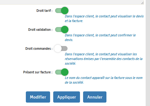 No more email exchanges, everything is centralized and available at any time.To activate this feature for your customers, you must manage your contacts' rights from the menu >Customers >Customer contacts. Go to the relevant contact's file and activate the desired rights: