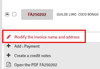 1. In the list of invoices, find the invoice concerned, scroll down the left-hand arrow and select ‘Modify the name and address of the invoice’ :