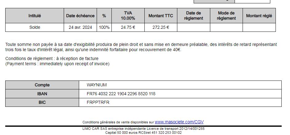 Si le numéro de l'IBAN est noté sous forme de texte libre dans le bas de vos factures, nous vous conseillons de retirer l'information de cette zone et de créer un IBAN dans le menu précité.
