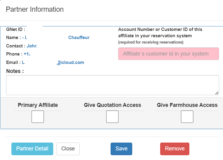 Ajouter le numéro de compte du partenaire dans GNet Une fois connecté, accédez à l'onglet Partenaires → Partenaire affilié . Trouvez votre partenaire, cliquez sur la carte pour ouvrir son profil d'entreprise. Dans la case rose, saisissez son numéro de compte LimoAnywhere et enregistrez .