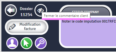 - A gauche : Le contenu de la case "commentaire" de la fiche client est visible tout le temps par défaut. Un bouton situé à droite du numéro de dossier permet de masquer ce commentaire.