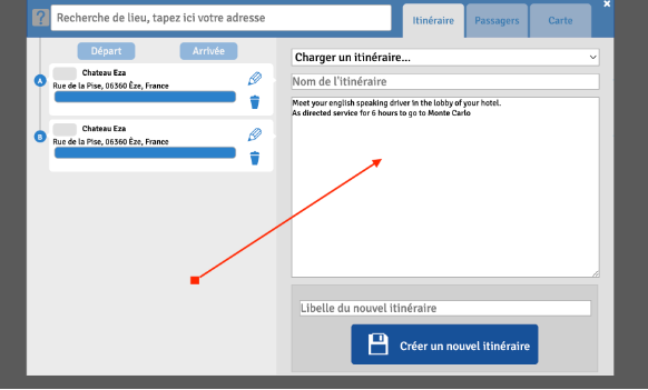 - Création d'un itinéraire depuis le planning : enregistrement des données saisies dans la case "description" en même temps que le libellé de l'itinéraire et les étapes.